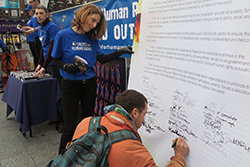 La Sra. Keogh describió un movimiento nacional de derechos humanos iniciado en los últimos 12 meses bajo el estandarte de Unidos por los Derechos Humanos: “Cada chico y chica en nuestro programa educativo llamado ‘Cuenta con Nosotros’ recibe un ejemplar de sus folletos sobre derechos humanos, junto con nuestro Taller Contra el Acoso Escolar. De hecho, cuarenta y ocho de nuestros voluntarios están usando el programa, de Cork a Limerick, y de Galway a Dublín. Con kits del educador bajo el brazo, están entregando seminarios y conferencias sembrando la semilla de los derechos humanos adondequiera que van. Y con casi 3000 estudiantes graduándose del programa, estamos construyendo un floreciente ejército defensor de los derechos humanos”.